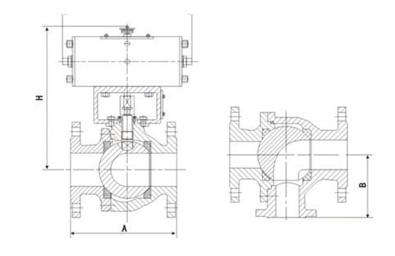 氣動三通球閥配用雙作用或單作用RC氣動活塞執(zhí)行機構(大口徑配用ZSH橫裝活塞執(zhí)行機構)。